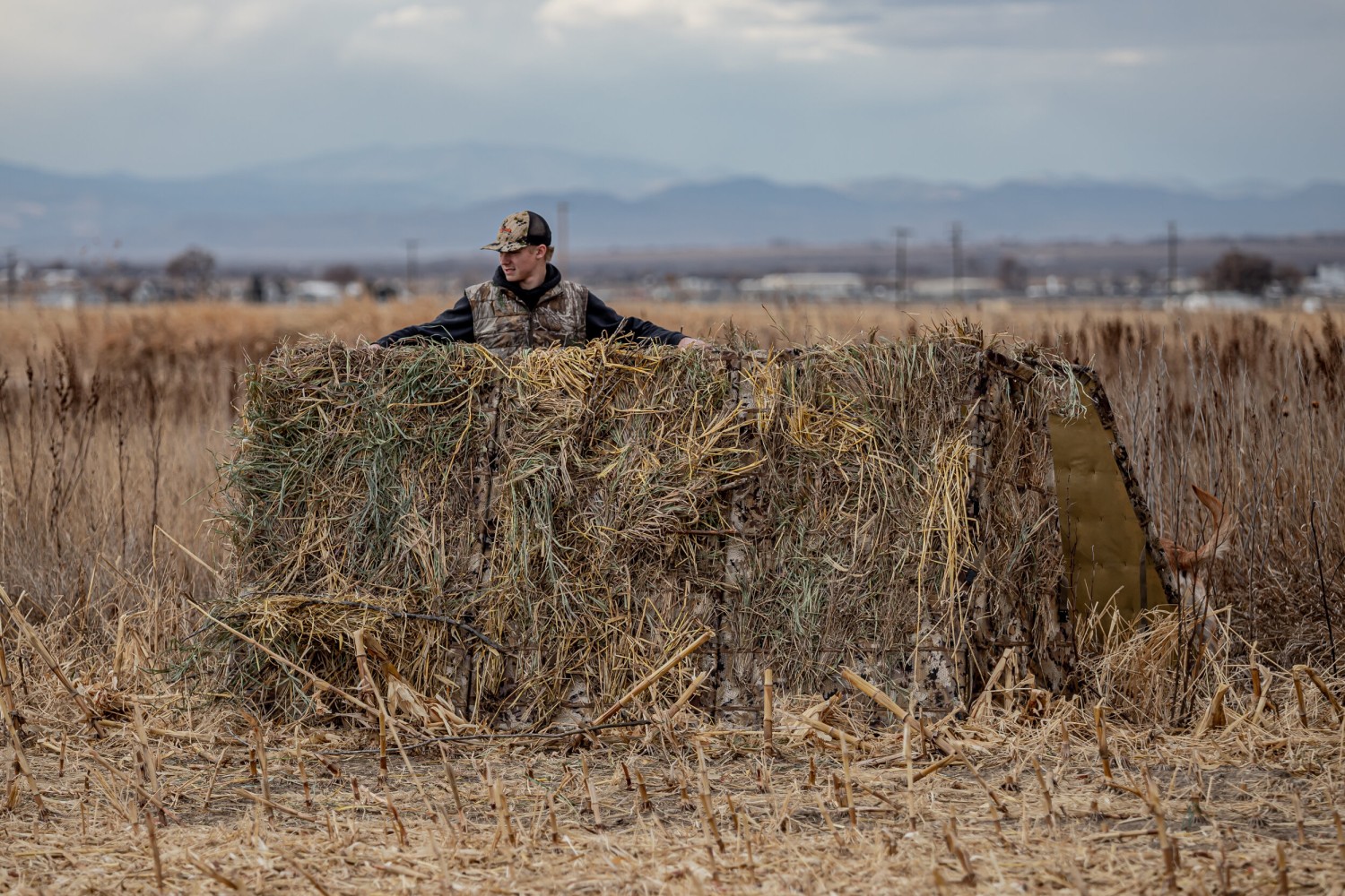 Just as silhouette decoys have made a comeback, the A-frame blinds we know today are simply the product of modern technology coupled with age-old tactics. Hunters have built these types of blinds for decades and used them religiously. However, today’s A-frames can be moved with relative ease, and grassed with whatever local vegetation is appropriate for the given situation. Hunters moved from the middle of fields to fence lines, hedgerows, and drainage sloughs where the cover was tall and abundant enough to accommodate a larger blind. The A-frame also allows easier shooting and all of the hunting and camera gear to be stowed inside the blind, out of sight to incoming flocks. This looked to be the go-to method for a few years, but once again things seemed to have changed.